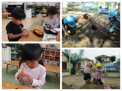 砂場でも大きな山、トンネル、山の上に大きなお城の屋根など、こちらの遊びにも異年齢でかかわりをもって遊んでいました。5歳児の影響力は大きいですね。