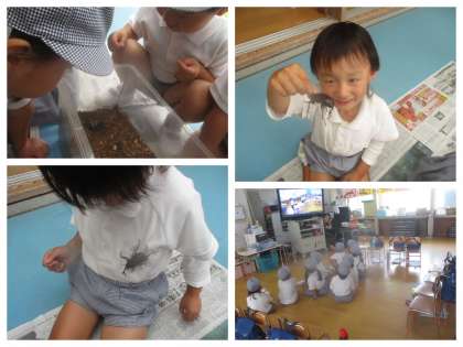 午後からは、カブトムシのお部屋の引越しをしました。オスのカブトムシをメスのカブトムシと一緒の飼育ケースにお引越しさせてあげました。最初は、恐る恐る触っていましたが、「持てた!」と一人の子が触ってみると、「僕も」「私も」と、触ってみようと手を伸ばしていましたよ。カブトムシの絵本も、興味をもって見ていました。