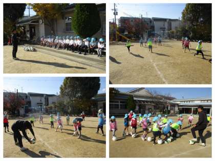 昨日からとても楽しみにしていた子どもたち。コーチの姿を見るなりやる気MAX!鬼ごっこをしたり、ボールを投げてキャッチしたり、サッカーにつながるいろいろな遊びを教えてもらいました。そして最後は試合も楽しみました。ゴールに向かって必死にみんなでボールを追いかけていました!シュートが決まると大盛り上がりでした(*^_^*)「もっとしたかった!」と次の1月のサッカー教室を楽しみしています♪