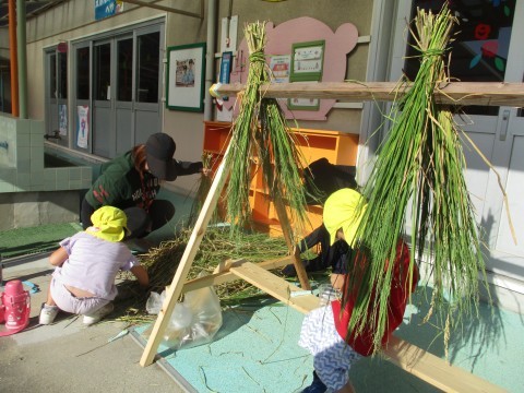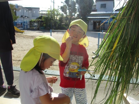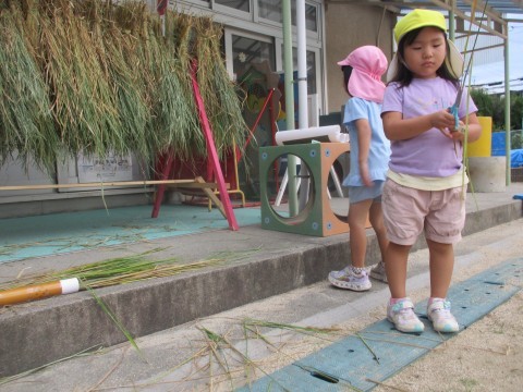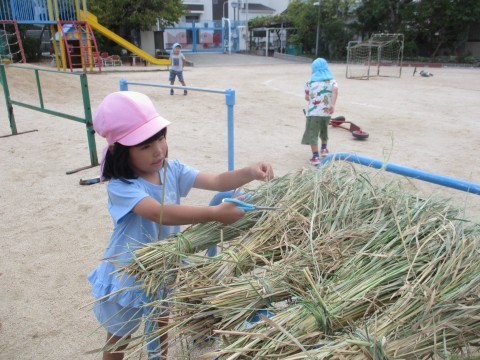 稲刈りをしている地域の方から藁を分けていただけると聞き、今日預かり保育に来ている子どもたちと一緒にいざ田んぼへ!たくさんの藁をいただいて幼稚園に持ち帰りました。早速藁を干せるように教師が束ねている傍らで、子どもたちは「みっけ!」と大忙し。どうやら藁についている稲穂を見つけては集め始めていました。そのうち稲穂は子どもたちの中で『お宝』になっていて、「お宝あったー!」そして1粒1粒稲穂から切り離して集めていることに驚きました。お米って1粒1粒が大切ですね。