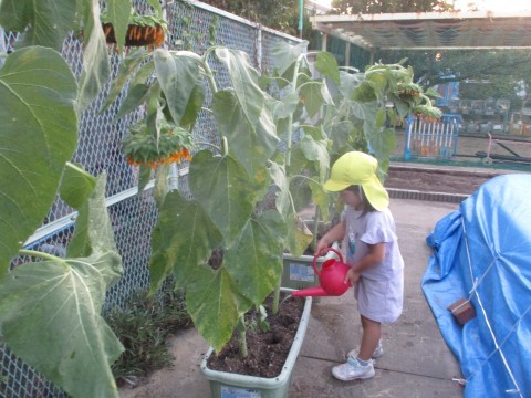 ひまわりにも水やりを続けています。今日は日差しがあったので夕方にもひまわりに水やりをしました。根っこに水が届くようにあげています。種ができるといいですね。