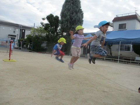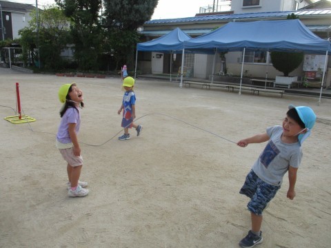 「まだ遊べる?」子どもたちはお迎えの時間までた~っぷり遊びました。友達とゲームをしたりパズルを一緒にしたり、神経衰弱のトランプゲームをしたりしてつくつくルームでは楽しんでいます。お昼寝やおやつの時間の後、園庭では「大繩したい!」との年長さんからのリクエスト。年少さんも一緒に大繩に挑戦!楽しいから何度も挑戦♪なんと3回も跳ぶことができて大満足☆また遊ぼうね!