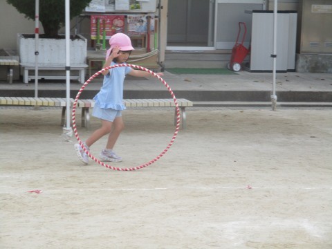 夕方になると日差しは少しやわらいできます。園庭を吹き抜ける風が心地よく、今日はシャボン玉を飛ばして遊びました。始めは手を動かすスピードが速く小さなかわいいシャボン玉がたくさんできていました。そのうちにだんだん大きなシャボン玉をつくろうとするようになり、飛ばしては追いかけてパチン☆「やったー♪」楽しくて何度も夢中になって遊びました。大きなシャボン玉をつくるのも、コツをつかんでだんだん上手くなっていました。伸ばした手をよ~く見ながら体をゆっくり動かしてみたり、高く飛んだシャボン玉に手が届くようにジャンプしたりして楽しんでいました。