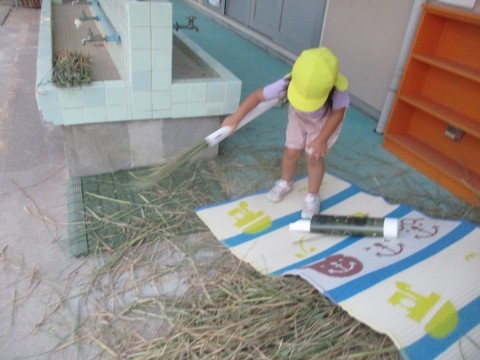 「きもちい~い♪」山盛りの藁の上にゴロン♪園庭で大繩をしたり鬼ごっこをしたりしたらちょっと一休み。ふかふかの藁が気持ちいいね!藁で遊びだした年少さんが箒でゴザの上をきれいに掃除してくれました。藁のいい香りがしていましたね。