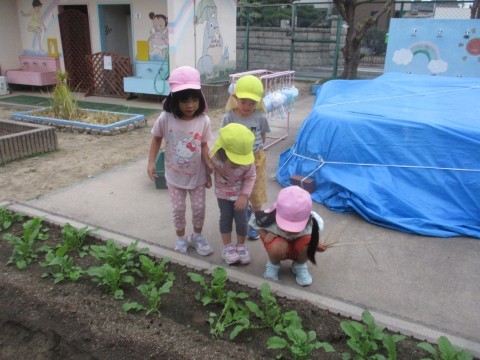 大根の畑にバッタを見つけて大騒ぎ♪捕まえようとするけれどピョンッと逃げられます。でも面白いからまた捕まえようとバッタとの追いかけっこです。今日はバッタが逃げきったのでバッタの勝ち☆バッタさんまた遊ぼうね~!