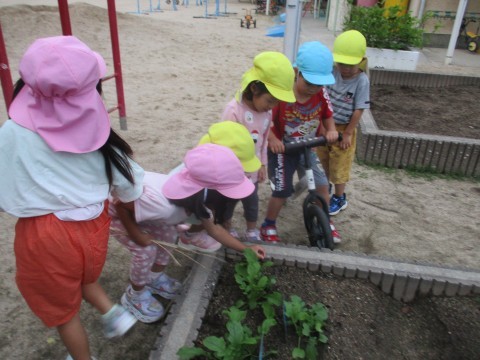 カブトムシのお世話をしていると子どもたちは興味津々☆固まっている土をほぐしてみたり、カブトムシを触ってみたりしていました。カブトムシがひっくり返ってしまうと起こしてあげようとするところに子どもたちの優しさを感じます。土は霧吹きで水をかけてよく混ぜるとフカフカになります。そのフカフカの土の中で眠っている幼虫を見つけると「顔の色が茶色!」「プニュプニュしてる♪」「カブトムシの赤ちゃん♪」とこちらにも興味津々です☆