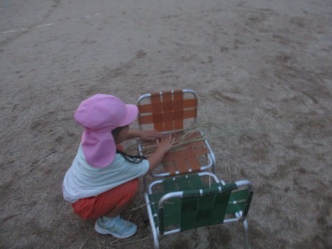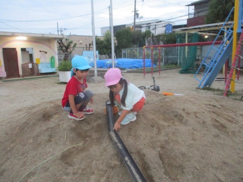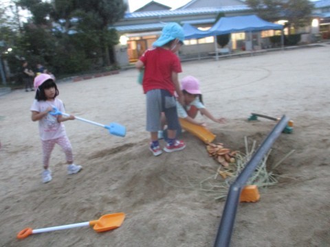 築山に樋をどんどん運び始めていました。何をしているのか尋ねると藁そうめん流しをするとのこと。藁や落ち葉を集めてはどんどん運んでいましたが、そこがフカフカしていることに気付くと今度は藁を敷くことが楽しくなってきたようで「ここはこどもの座るところ♪」「ここは先生の座るところ♪」日が暮れるまで遊びました。