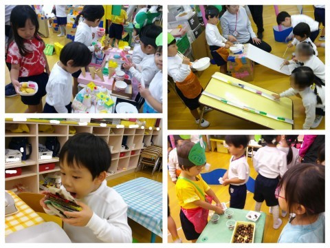 早速、帽子をかぶってお店屋さんごっこを楽しみました☺あれもこれも楽しみたいようで、両手いっぱいに食べ物を買いに行く子もいてましたよ!繰り返し遊ぶ中で、