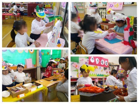 と、お店屋さんとお客さんとのやり取りも楽しいようで、生き生きとした表情で遊んでいます♪同じお店屋さんの中で、