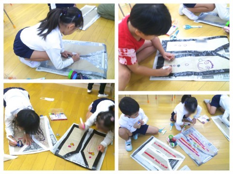今日は朝からハッピを作りました。「背中側には大きく名前を書こう」とみんなで決めたので、表側には思い思いにペンやカラーテープで模様をつけました。午後、たんぽぽ組さんをだんじりまつりに招待する時にはさっそく着て、はりきっていた子ども達です(^▽^)/