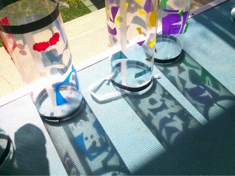 すみれ組のだんじりまつりは、遊戯室のテラス側の入り口から入ることになっています。廊下や遊戯室は、染め紙でつくった提灯が飾られているのですが、テラスには何も飾っていなかったので、「雨に塗れても大丈夫な提灯をつくろう」と取り組みました。色とりどりのセロハンシールを透明なシートに貼っていきます。セロハンシールをなるべく無駄無く使い切れるよう、模様を工夫しながらつくっていました。提灯が完成したタイミングで、ちょうど晴れてきたので「外に出て見てみよう」「お日様の光をあててみよう」と嬉しそうにテラスに持って行きました。日光があたると、自分達の作った模様が影として出てくるだけではなく、セロハンの色で影の色も変わることも発見して大興奮!「『つくってあそぼう』でお家の人が来てくれる時も、晴れてたらいいなあ」と話して楽しみにしている様子でした(^▽^)