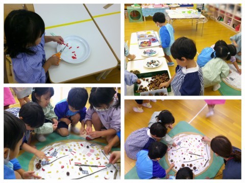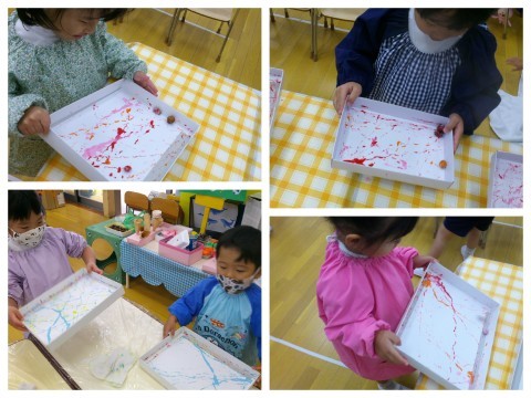 今日は、どんぐりを使って新しい遊びをしました。箱に紙を敷いて、絵の具をつけたどんぐりをころころ♪どんぐりが通った道が、どんどん増えていきました!勢いの良いどんぐりは、箱から飛び出す瞬間も(^O^)「わあ!楽しい!」「ころころ~」「あれ、止まっちゃった」「とんでった!」と、夢中になってころころしていましたよ。