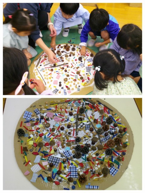 他にもどんぐりや松ぼっくりなどの自然物を使ったり、制作材料としてお家から持ってきてくれていた布切れやボタンなどを使って大きな飾りを作りました。飾りの一つとして、ストローもチョキチョキ。紙以外のものも初めてハサミで切ってみましたよ。大きな丸い段ボールにボンドを塗り広げて、みんなでどんどん飾り付け♪立体的な素材を立てたり、寝かせたりして、子ども達の思うままに飾っていくと・・・素敵な自然物のアートのようになりました!