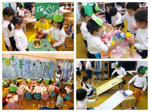 お弁当前には、たんぽぽ組さんの『カエルひろば』に遊びに行かせてもらいました。おいしそうな食べ物屋さんや、楽しそうなドングリ転がしや流しそうめんに、すみれ組の子ども達も大喜び!たくさん遊んでたくさん食べて、あっという間の交流でした。2クラスの振り返りでは「流しそうめんが、速いところとゆっくりなところがあるのが面白かった」「食べ物屋さんが全部おいしかった」と楽しかったことを伝えたり、「ドングリ転がしで、なかなかドングリを渡してもらえなくて待ってたよ」とアドバイスを伝えたりしていました。他のクラスの遊びに参加させてもらうのは初めてだったので、とても楽しかったようです。「次はさくら組にも行きたい!」と話しています(^▽^)/