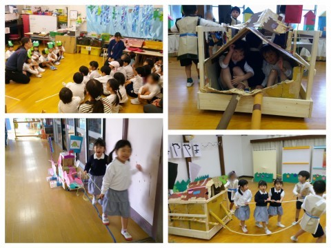 と、とっても張り切っていた子どもたち。何度も、すみれ組さんが作っただんじりで遊ばせてもらっているさくら組さん。早くすみれ組さんにもむしむしらんどで遊んでほしいな!と、ずっと楽しみにしていたようです。「いらっしゃいませ!」の声にも力が入っていました。