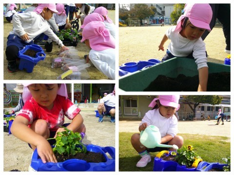 今日は、気持ちの良い気候で園庭でゆったり遊びました。お店屋さんごっこを楽しんだり、フラフープで連なってだんじり遊びを楽しんだりと、楽しそうに遊んでいる姿を見つけると…友達が集まってきましたよ♪プランターに、新しい花も植えましたよ。好きな色のパンジーの苗とチューリップの球根を選んで植えました。