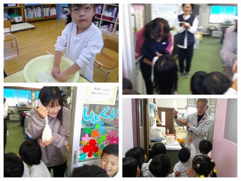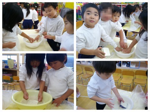午後からのお楽しみでは、「小麦粉粘土」で遊びました♪初めて見る白い粉。「なになに?」「塩?」「粉だ」「あ、パンケーキの粉」と、興味津々!自分でコップ1杯の粉をすくうのも楽しくて「わー楽しい!」と声がこぼれていました♪「やわらかい!」「さら砂みたい」「あれ、固まった」「みて、手形できた!」と、ボウルに入れた粉をどんどん触って感触を味わったり、触ることで変化する面白さに気づいたり、夢中になって粉に触れる姿が見られました。友達が手にギュッと握って粉が固まる様子を見て、真似てみたりと、友達の姿や声にも興味をもち、自分でもやってみようとする姿もありました。粉で存分に遊んだあとは、さらに面白くなるように、水を加えていきました。自分でスプーンですくって少しずつ水を加えていくと、ふわふわやわらかかった感触が「ねちねちする」「ねばねばだ」「くっつく」「もちもちする」と、変化していくことを感じ、「もっと水いれたい」と、試そうとする姿につながっていきました。だんだん塊になると、丸めたり、ちぎったり、こねたり、伸ばしたりして遊ぶことが楽しくなり、「おもちみたい」「パンみたい」と見立てる姿が(^O^)そこで・・・みんなで好きな形のパンをつくることに♪パン職人になってできたパンは「どんぐりパン」「ピザパン」「まるパン」「ハートパン」「ぎざぎざパン」「メロンパン」と、いろいろな形のパンに・・・♪パン窯で1日焼いて、どうなったかは明日のお楽しみ(*^-^*)
