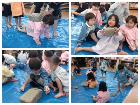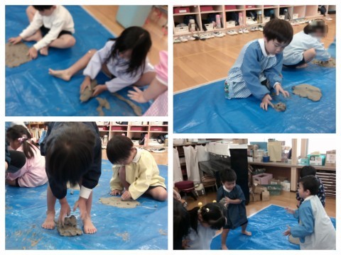 と、土粘土特有の冷たさや重さを感じていました。背中にのせてカメさんになったり、ほっぺをつけてみたり☺はやく触って遊びたい子どもたち♪