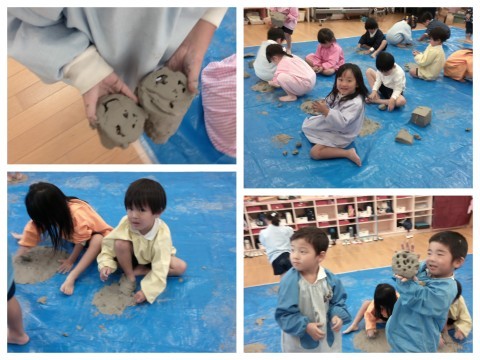 午後の遊びでは、土粘土で遊びました。普段遊んでいる油粘土とは違い、大きな塊にみんな釘付け!箱から出すと、ドスン!という音にみんなびっくりです!はじめは、土粘土をビニールの上から触ってみたり、持ち上げてみたりしました。