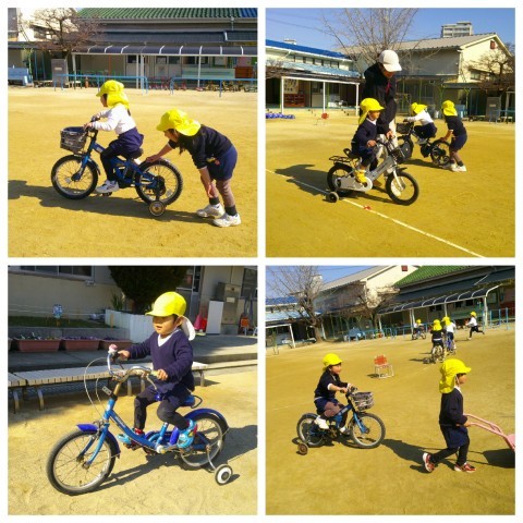 今日は朝から遊戯室で劇遊びの取組がありました。「3匹のこぶた」の劇遊びを楽しんだ後に、園庭でゆったりと遊びました。補助輪がついた自転車に挑戦中の子どもたち。代わり合って遊んでいました。力いっぱい足で自転車をこぐ姿に、体の成長を感じます。