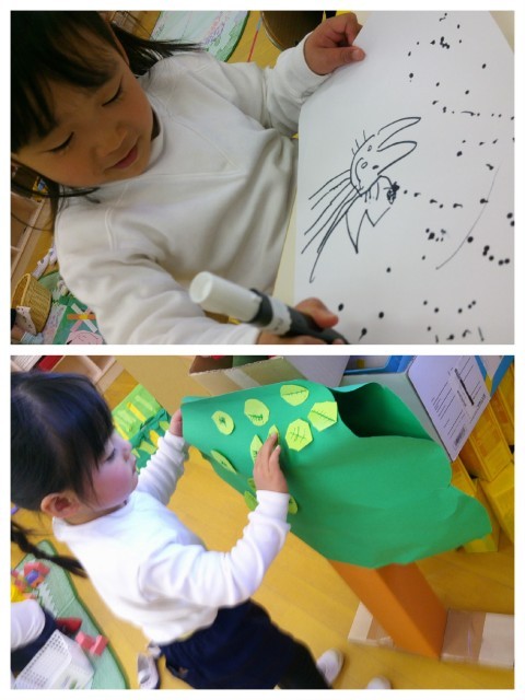 昼食後はそれぞれに好きな遊びを楽しんでいました。中には、お絵かきや劇遊びで使う道具作りをする子の姿も。つもりになって表現することに加え、絵を描いたり、作ったりして表現することも楽しんでいます。
