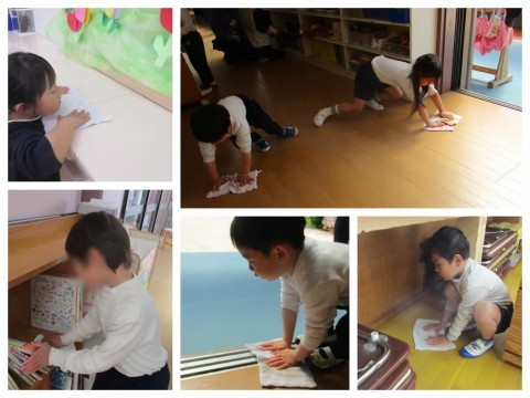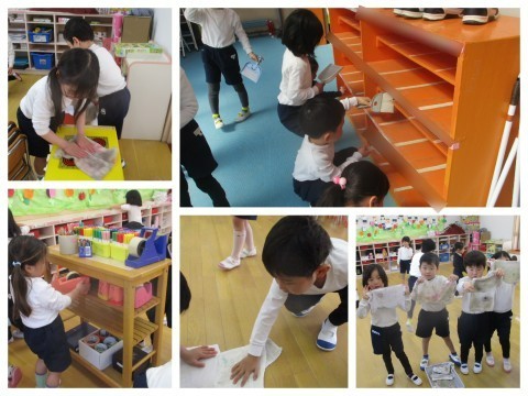 今日は、1年間使ってきた保育室や靴箱の大掃除をしました。雑巾がけをしてピカピカになりましたよ。