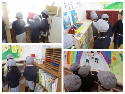 お道具箱の整理もして、さくら組の保育室に運びに行くと、「こんなおもちゃある」「楽しそう」「もうすぐさくら組だ」と、ワクワクしていました♪進級も待ち遠しいですね。