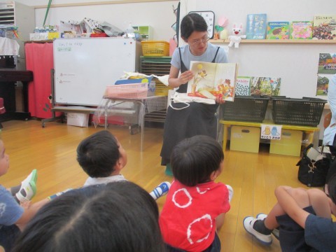 今日も絵本サークルの方が楽しい絵本を持ってきて、読み聞かせを行ってくれました。読んでもらうと面白くてケラケラ笑ってしまう場面や、スリリングな場面では真剣な表情で、保育室がシーンと静まり返っていました。「この絵本おもしろいな」「もう1回読んで!」という声も上がるくらい、毎回の絵本の読み聞かせを楽しみにしている子どもたちです。