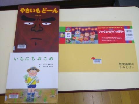 ハロウィンやサツマイモ、お米に関するものなど今の子どもたちの興味・関心のあることを題材にした絵本をもってきてくださいました。