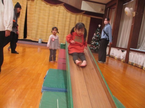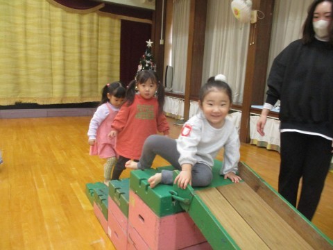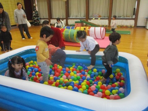 風が冷たくなってきている今日この頃、幼稚園の遊戯室で滑り台をしたりボールプールに入ってみたりして体を動かして遊びたいと思います。お家の人と一緒に、体も心もほっかほかになって遊びませんか?遊戯室には大きなクリスマスツリーもありますよ。ぜひ幼稚園に遊びに来てね!