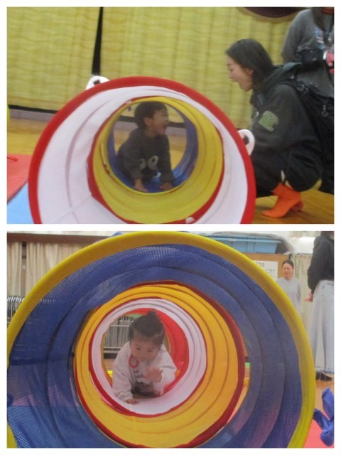 滑り台やボールプール、トンネルなど好きな遊びを選んで存分に遊びました。ボールプールは大人気☆もぐるようにボールに埋もれて楽しんでいました。滑り台では順番に並んで遊ぶことができましたね!トンネルは始めは2個あったのですが、繋いで長いトンネルに・・・ユラユラ揺れる長いトンネルでも平気☆ズンズン進んで行きます。お家の人が見守ってくれている中、安心して遊ぶことができましたね。