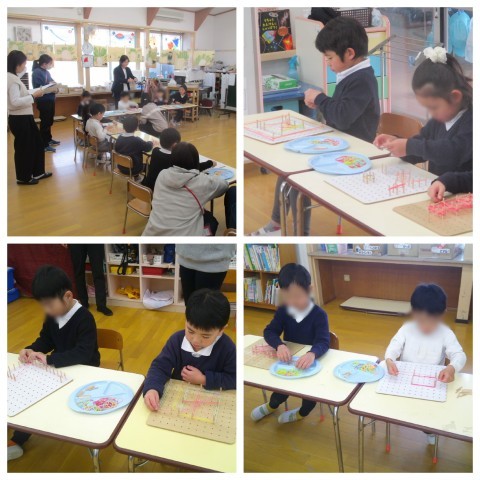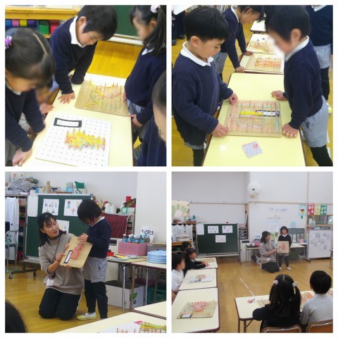 輪ゴムを伸ばしたりねじったり、引っかけたり半分の長さにしたり様々に手指を操作し、輪ゴムを木ダボに掛ける位置や左右対称にこだわったり、様々な図形に気付くきっかけにもなりました。今度はかわいいお花も作って飾り、保護者の方が喜んでくださるのを楽しみにしたいと思います。