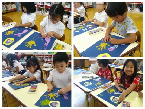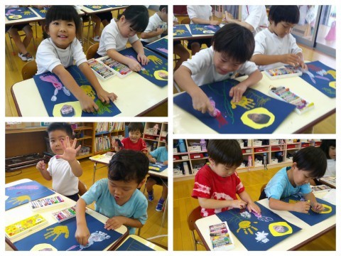 十五夜と言えば、大きな真ん丸お月様✨お月様の中にうさぎがいるという説もありますが、今回は、月の中には自分の顔が!子どもたちも可笑しくて、自分や友達の顔を見ながら大笑いしていました(^O^)