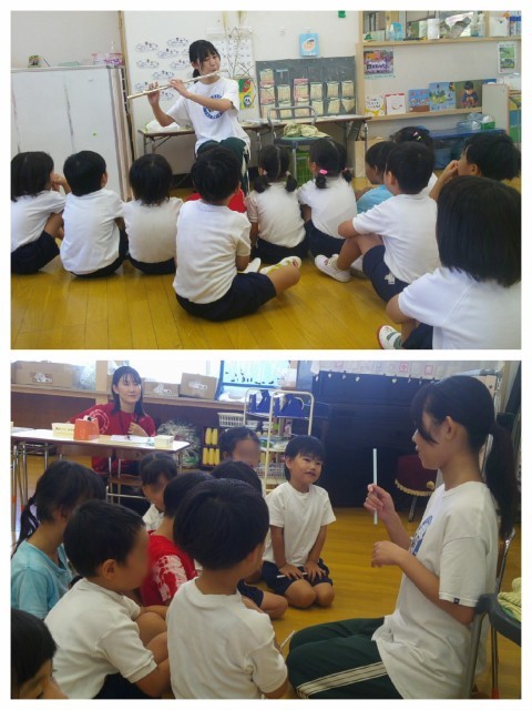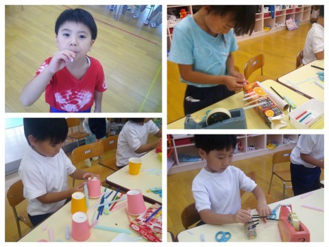 『やまのおんがくか』の歌で知った『フルート』の楽器を吹いて聴かせてもらった後、「ストローでも笛が作れるんだよ」とストロー笛づくりに挑戦しました。ストローの中に息を細くして吹きかけると音が鳴ります。ストローの長さや太さを変えたり、ストローの先を指やテープでふさいだりすると音が変化します。そのことに気付き始めた子ども達は「もっと作ってみる!」「この長さにしたらどうかな?」とどんどん試していきました。その後は箱やカップにストローをつけて、オリジナル楽器作りにも取り組みました。最後の振り返りでは「〇〇君の音がきれいだった!」「〇〇ちゃんの楽器、素敵だと思う」と嬉しそうに話す姿がたくさん見られました。