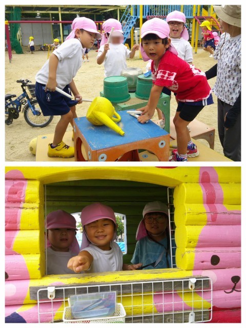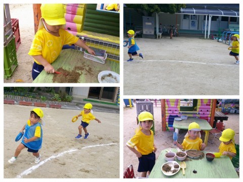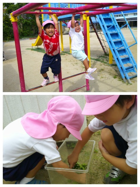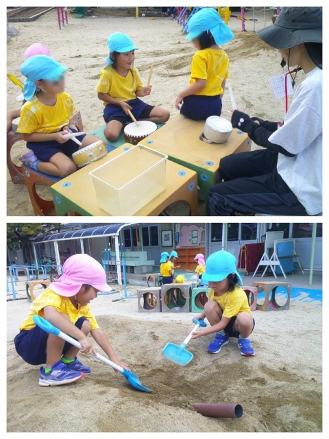 今日は朝はゆったりと園庭で遊びました。レモンの木でみつけたあおむしのお世話をしたり、体を動かして遊んだり。他にも、ボックスを積み重ねてだんじりに見立て、鍋を使って音を鳴らしてだんじりごっこをしたり、レストランごっこをしたりと友達ともかかわりも楽しんで遊んでいます♪