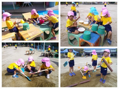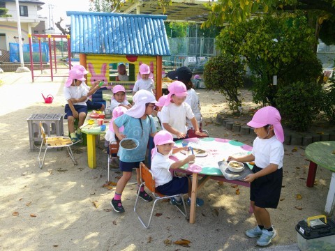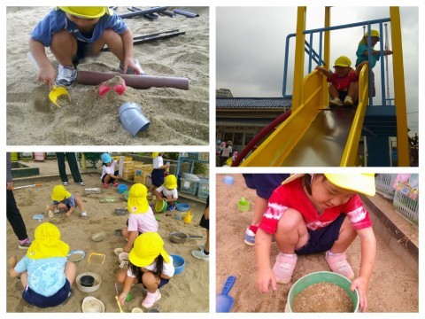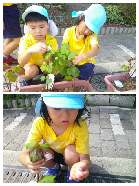 まだまだ暑さは残っていますが、涼しい風も時折吹き始めています。園庭ではリレーや砂遊び、だんじりごっこなどが盛り上がりました。春に植えた綿が暑い夏を越えてすくすくと育っています。ふわふわの白い綿が出てきた子から、綿の収穫をし始めています。「ふわふわやなあ」と嬉しそうに採っていましたよ(^▽^)