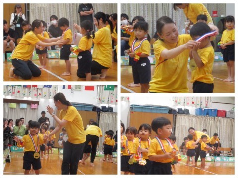 最後は、頑張ったみんなに園長先生から金メダルをいただきました。今日は、大好きなおうちの方に応援してもらい、いつも以上に輝いていた子どもたち。キラキラ光るメダル以上に子どもたちの顔も光輝いていましたね♪今日の経験がまたひとつ、大きな成長につながったと思います。張り切って頑張る姿、少し緊張して戸惑う姿など様々な姿が見られましたが、どの子も一生懸命頑張っていましたね♪お家に帰ってからも、子どもたちの頑張りを振り返ってもらえればと思います。また、お家に帰ってからどんな様子だったか教えてくださいね(^^♪