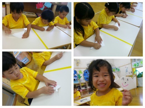 クラスでは、「中秋の名月」「お月見」にちなんだ絵本を見ました。そこから、折り紙で「ウサギ」を折りましたよ。三角折りから、耳の部分を折るときには、「チューリップの折り方みたい」と、今まで折ったことのある折り方を思い出している姿もありました。1回折ったら「もう1回したい」と、繰り返し折ることを楽しみました♪