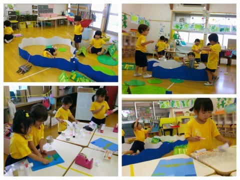好きな遊びの中で、カエルになったり、カラスになったり、ザリガニになったり、友達と一緒にカエルごっこも楽しんでいますよ。