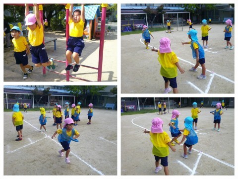 運動会明けの火曜日、今日も元気いっぱいの子どもたち。好きな遊びの時間には、だんじりごっこや雲梯、サッカーで遊んでいました。運動場にたいこの音が鳴り響いています✨今週は地域のだんじり祭りがあります!楽しみですね♪運動会で年長さんのリレーに取り組む姿を見てきたさくら組さん。バトン渡しも上手にしていましたよ!走るコースや順番などとくに教えたわけではなく、自分たちで取り組む子どもたち。今までの年長さんの姿を見てやり方を分かっていたようです♪力強く走る年長さんの姿に刺激を受け、“もっとやりたい!”と言って走っていました☺