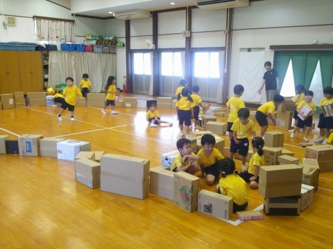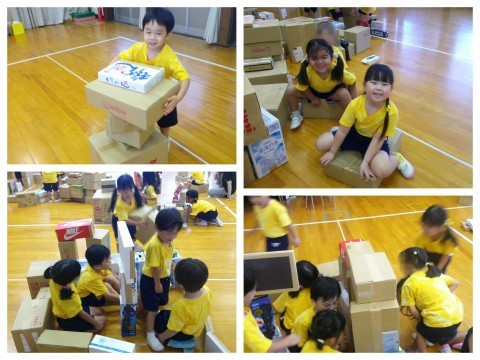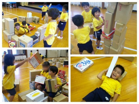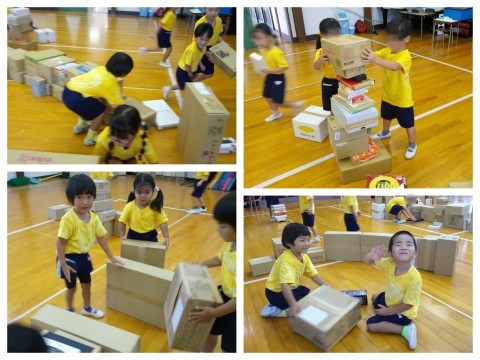 好きな遊びの後は、遊戯室に行って箱を使って遊びました。運動会の親子競技ではつみつみ遊びが盛り上がりましたが、今日は、箱を使って、お家や船、だんじりなど様々なものに見立てて遊んでいました。