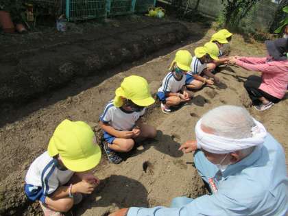 今日は幼稚園の畑にいんげん豆の種を撒きました。一つの穴に3つずつ入れて,やさしく土のお布団をかけて・・・。「おいしいお豆ができますように」「大きく育ちますように」と声をかけていました。明日から水やりをして生長をみていこうね。収穫する日が楽しみですね。