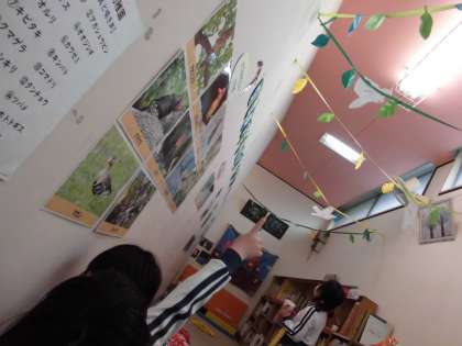 図書スペースに大泉緑地のいろいろな鳥を楽しむコーナーができました。昨年度のPTAさんや地域の方々のご協力のもとご準備いただいたものを展示したものです。鳥のさえずり音も流れています♬鳥の名前や鳴き声,飛来の季節については,いつもお世話になっている佃さんにも教えていただきました。