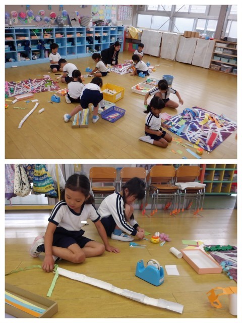 明日は作り上げたコースターでどんぐりを転がして遊びます。また、お友達の作ったコースターも楽しむ予定です。楽しいどんぐりコースターにしようね♪