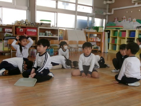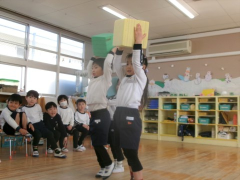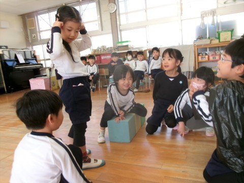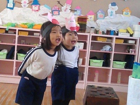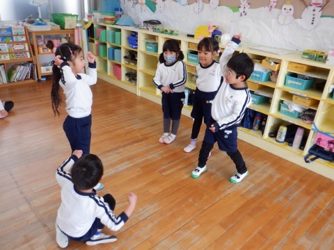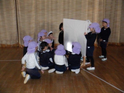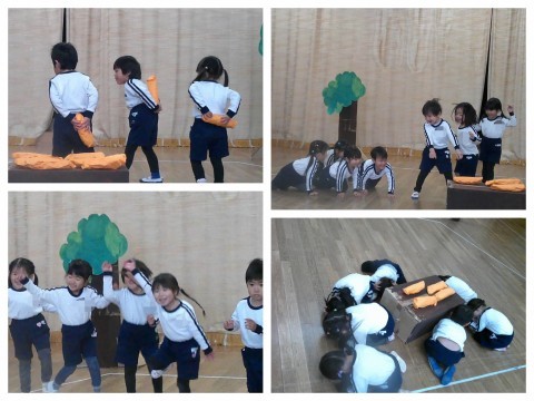遊戯室で劇遊びをしました。今日は見てもらう人を意識して,大きく動くことや,おしりを見せないことを意識してとりくみました。