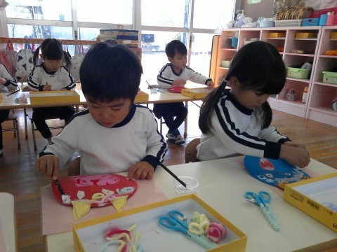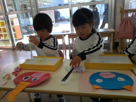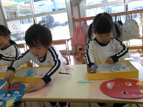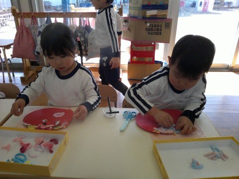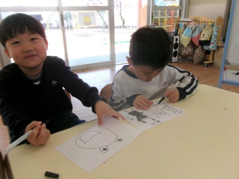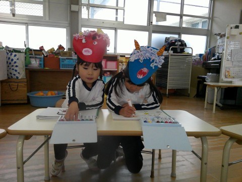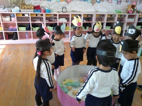 今日は、節分の日。登園後、出席ノートにまめまきのシールを貼り、「きょうは まめまき♪」となんだか楽しそう!!豆入れを折り紙で折り、「1・2・3・4・5!」と、自分で豆を数えて入れました。「“おには~そと~”ってする!」と元気いっぱい言っていて、張り切ってみんなで豆まきをしようと戸外に出ると、赤鬼が出現!!みんな、あんなに張り切っていたのに、あっという間に「きゃ~!」と逃げていってしまいました・・・。かわいらしいですね。でも、赤鬼がおうちに隠れていると、探しに来て「おには~そと~!」と、豆を投げていました。少しずつ「おには~そと~」の声も大きくなってきて、赤鬼さんが退散していきました。みんなのパワーってすごいね!赤鬼がいなくなると、ホッとした表情を浮かべるもも組さんでした。