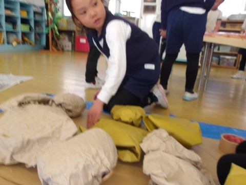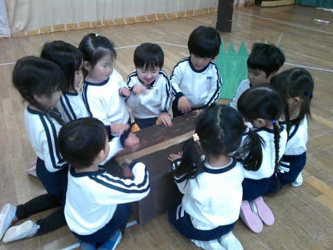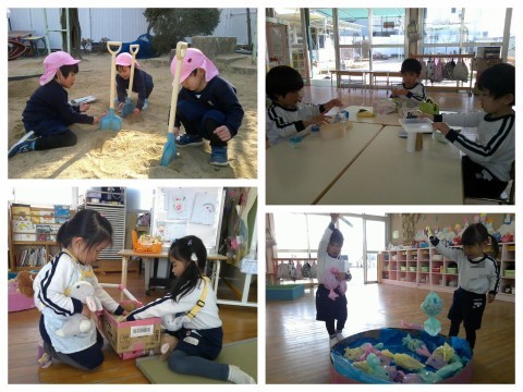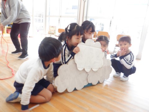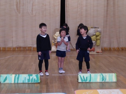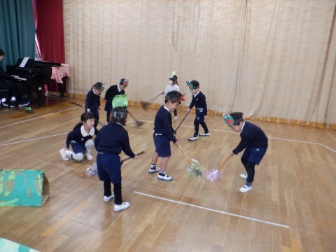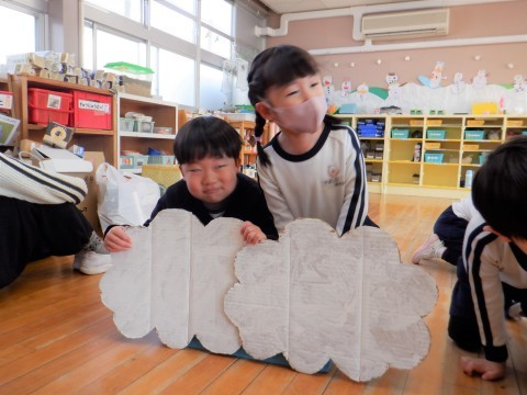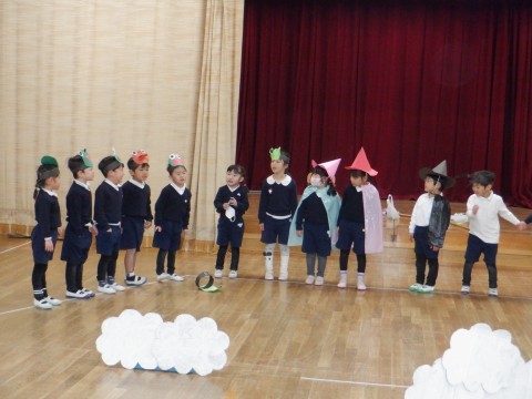今日も劇遊びの練習を遊戯室で行いました。「つぎは僕だ!」と子どもたちは登場の仕方や物語の流れがだんだんとわかるようになってきました。明日は劇遊び予行日なので一生懸命頑張っている姿を他のクラスにも見てもらおうね!