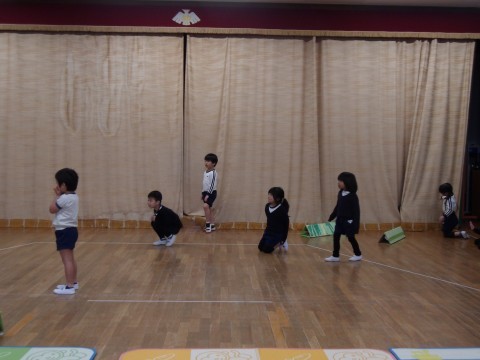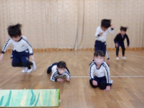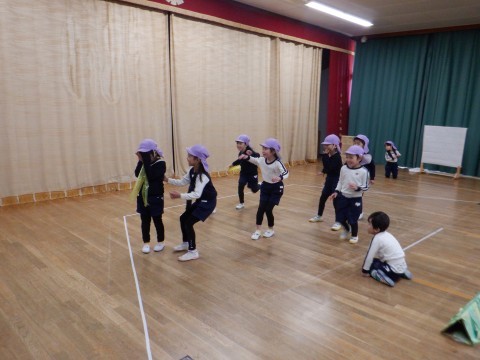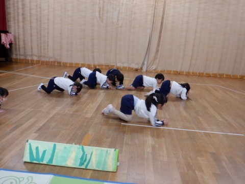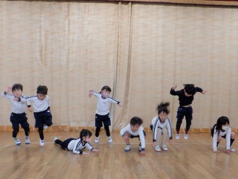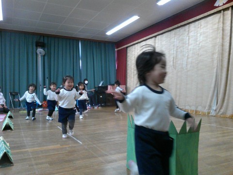 表現遊びの練習を遊戯室で行いました。保育室よりも広いので、からだいっぱい使って表現を楽しみました。セリフも少しずつ話せるようになってきました。