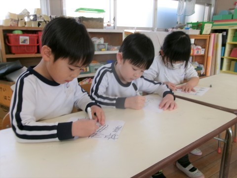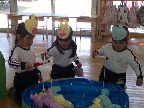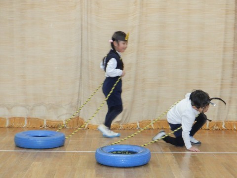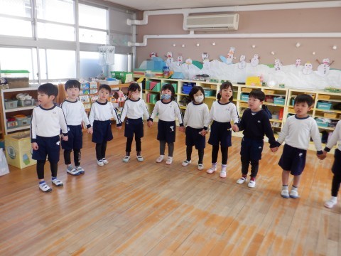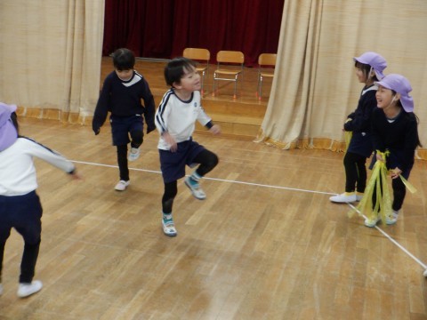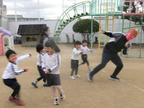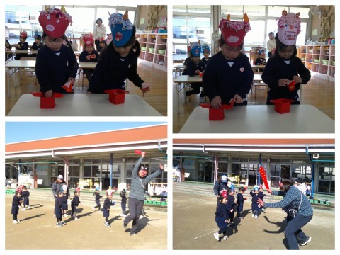 様子を見ていたお友達もいつの間にか外で一緒になって、豆を投げて鬼を追い払うことができました。最後は「たのしかった!」と嬉しそうな顔がたくさん見られたたんぽぽ組でした。