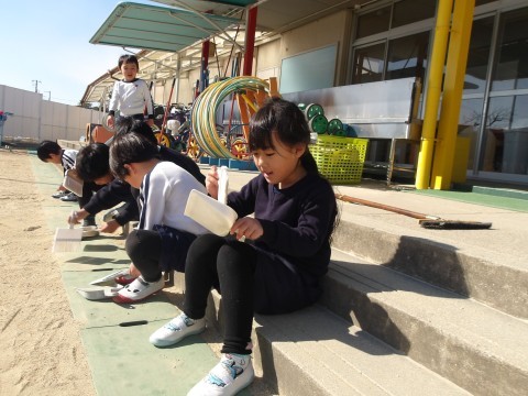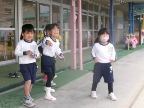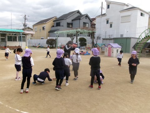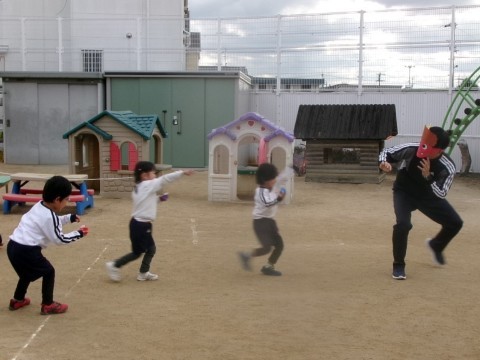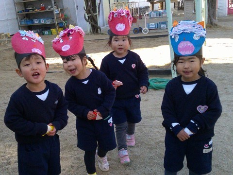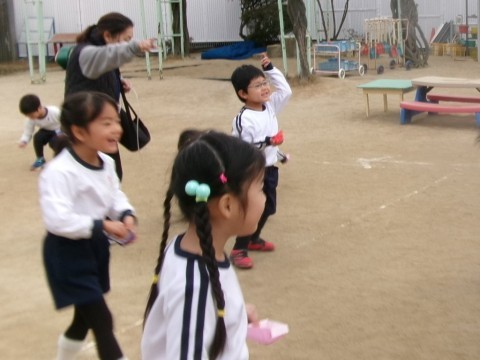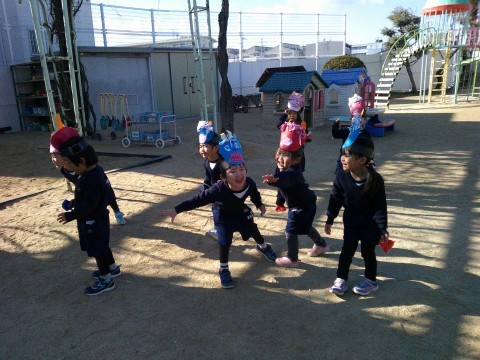 今日は節分でしたね。園庭で豆まきをしました。「おにはそと!」と元気いっぱいに豆をなげていました。